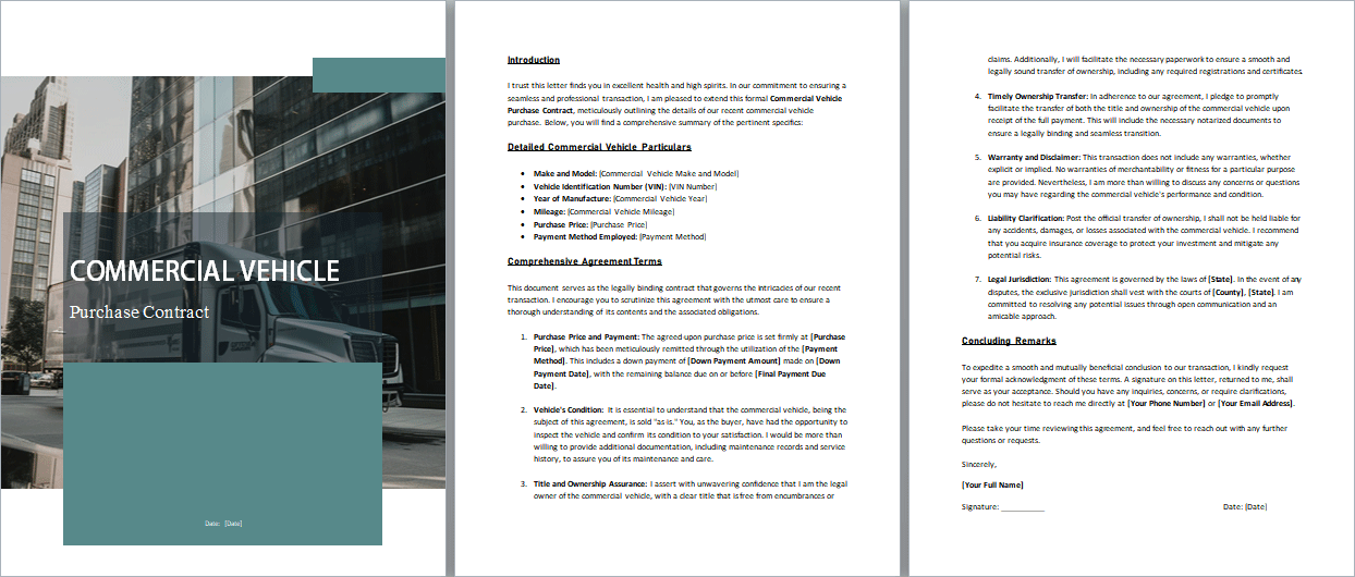Buying a commercial vehicle is a big deal for your business. This contract makes sure the whole process is crystal clear. It's like a rulebook that spells out all the details, rights, and duties for both the buyer and the seller. Our aim? To protect both sides and make this deal legit and fair.