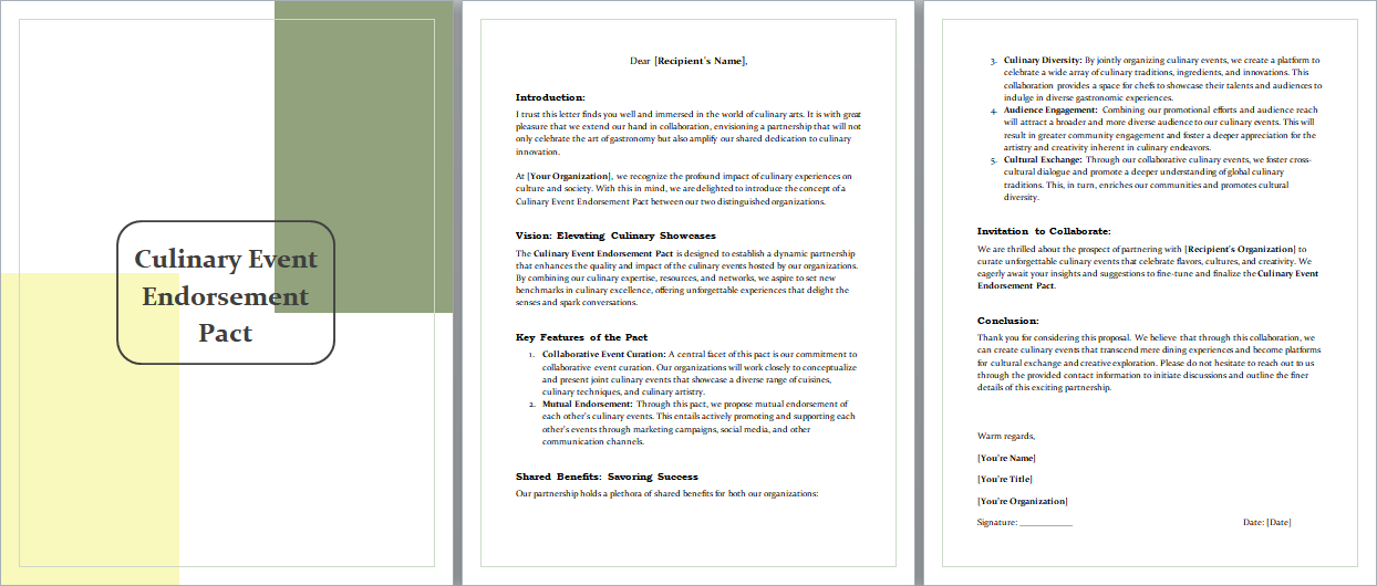 The Culinary Event Endorsement Pact is your trusty sidekick for cooking up successful culinary partnerships. Download the template, infuse it with your culinary dreams, and get ready for a delicious journey where culinary excellence meets success.