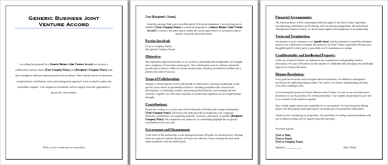 Think of this accord as your versatile tool for navigating diverse business joint ventures. It outlines roles, commitments, and shared principles, forming the foundation of successful collaborations.