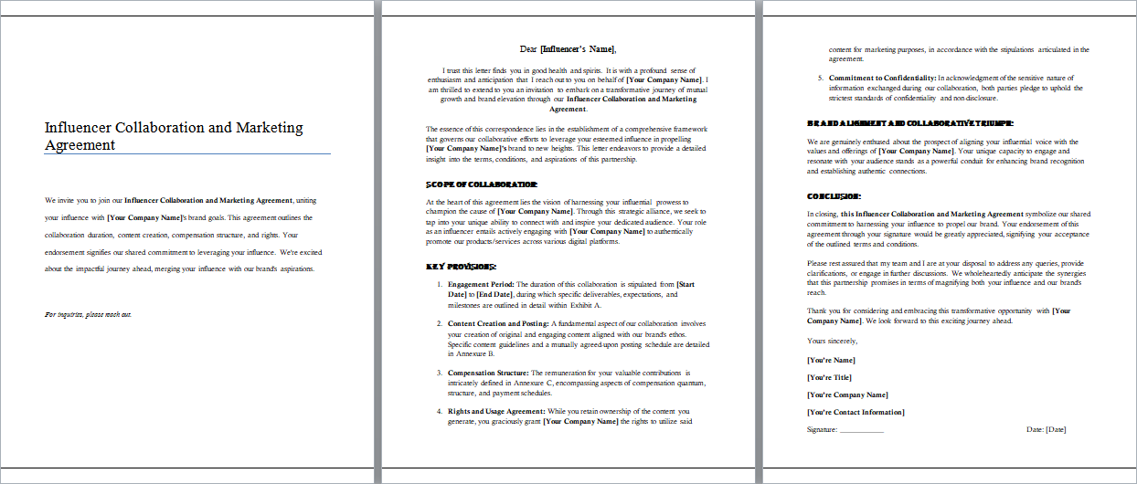 Download the template, infuse it with your essence, and embark on a journey where creativity meets successful marketing ventures. Together, let's redefine collaborations, navigate campaigns, and establish agreements that cater to your individual and brand's collective success.
