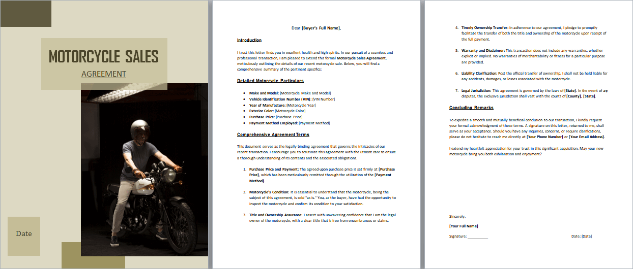Consider this agreement as your trusty helmet and gear. It's designed to protect you, outlining all the important details of the motorcycle sale. It's a legal assurance, securing the interests of both parties involved and making the transaction a breeze.