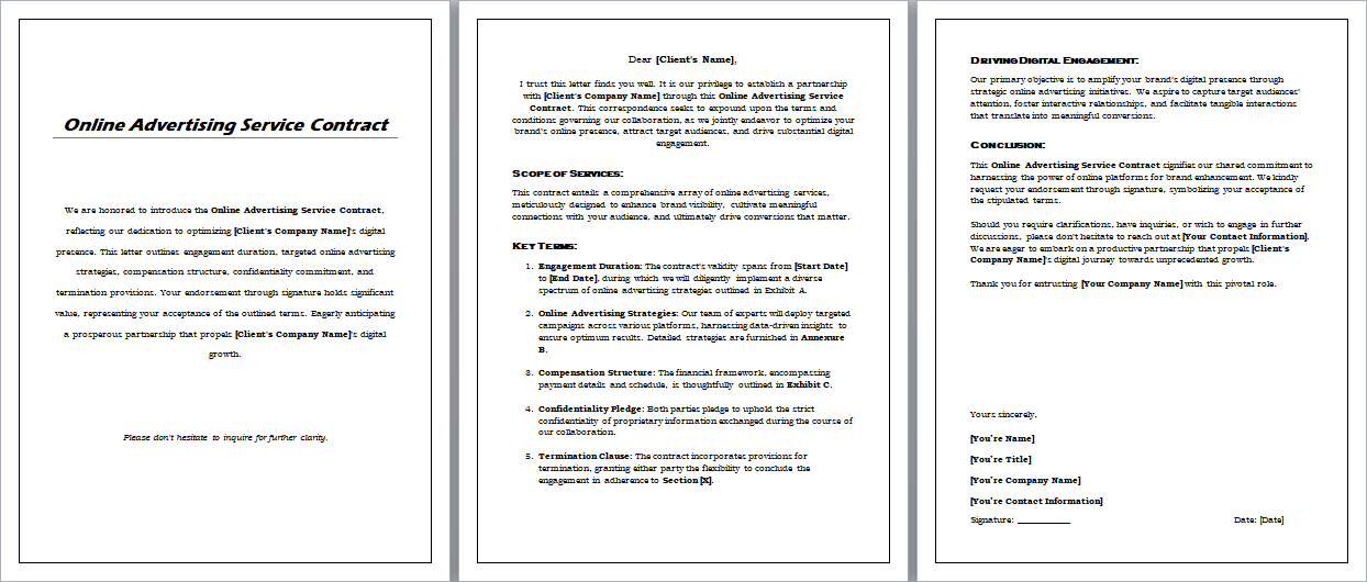 The Online Advertising Service Contract is our compass for successful advertising teamwork. Download, customize, and let's make our online presence shine!