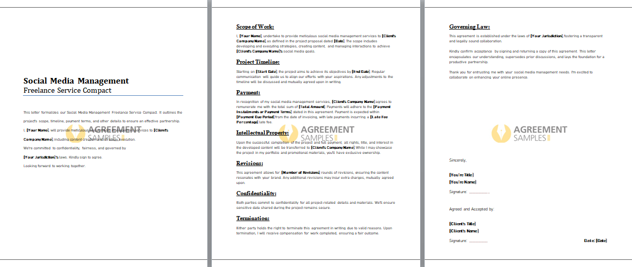 The Social Media Management Freelance Service Compact is your roadmap to online impact. Download the template, add your personalized touch, and embark on a journey where digital engagement meets collaborative spirit. Together, let's amplify voices, forge connections, and create a digital presence that resonates.