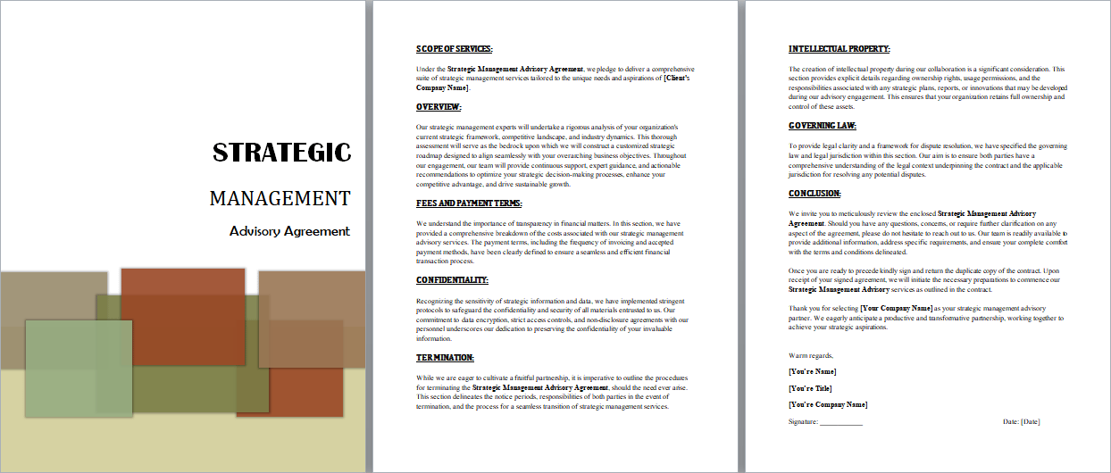 Think of this as your roadmap to understanding strategic management advisory services and how they can supercharge your organization. On this page, we'll break down the key aspects of a strategic management advisory agreement in simple, everyday language.