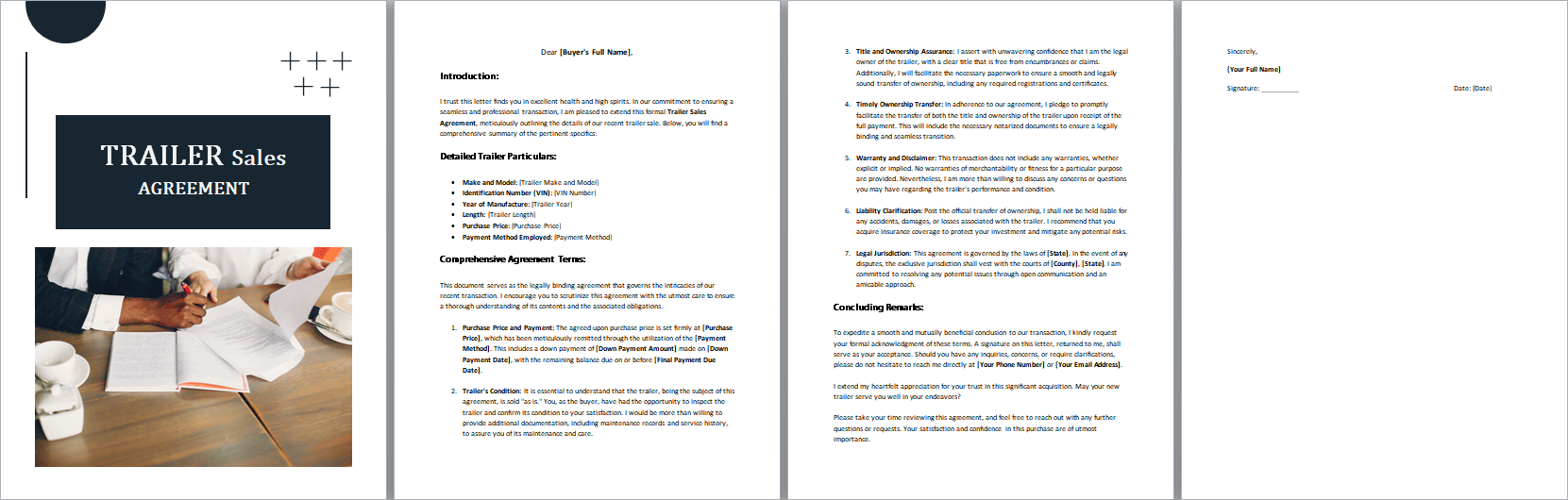 Imagine this agreement as a friendly guide, explaining the ins and outs of buying a trailer. It's here to make sure everyone is on the same page and protect each other's rights throughout the transaction.