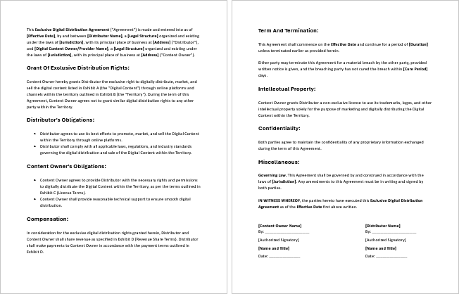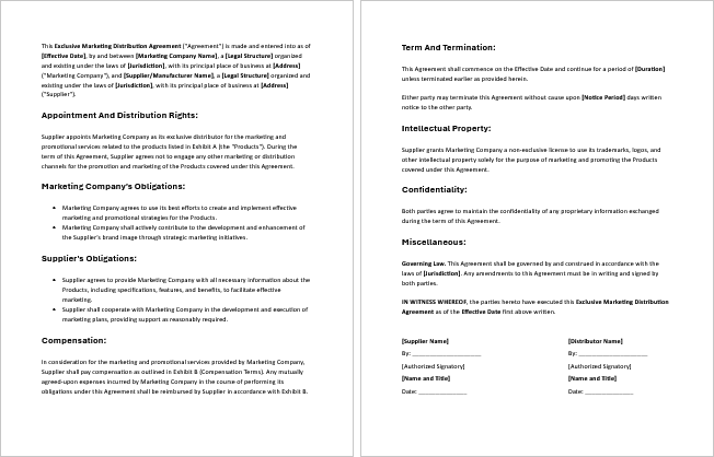 Customizing your exclusive distribution agreement templates in MS Word is quick and straightforward. Each file is pre-formatted with placeholder text, so you can simply replace it with your business details—no design or legal formatting skills required.