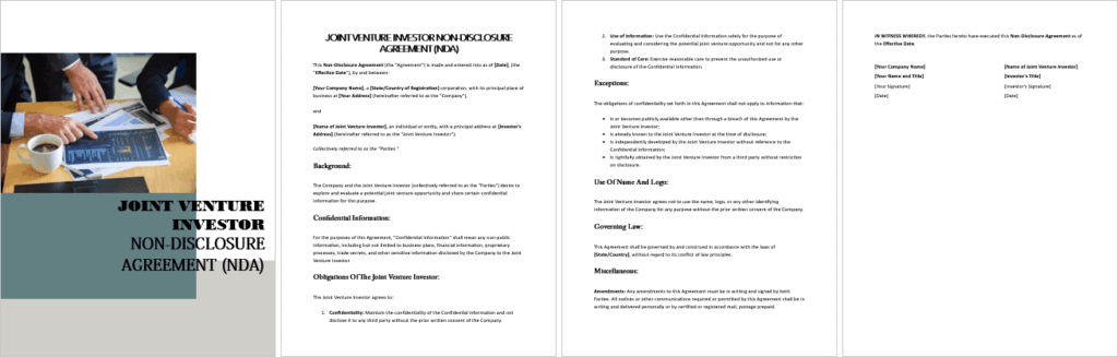 Embark on a journey of enhanced confidentiality and legal protection with our exclusive collection of Investor Non-Disclosure Agreements (NDAs), fully customizable in Microsoft Word format. Secure your business plans, financial strategies, and creative concepts with these meticulously crafted templates. The power to safeguard your investments is just a click away!